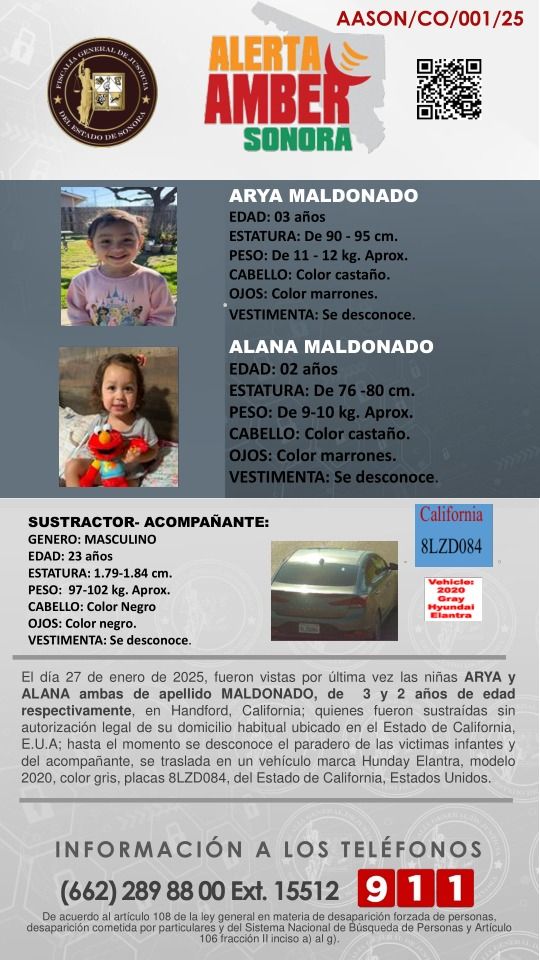 SE ACTIVA ALERTA AMBER SONORA PARA BÚSQUEDA y LOCALIZACIÓN DE ARYA y ALANA ambas de apellido MALDONADO, de 3 y 2 años de edad respectivamente, sustraídas en Handford, California.