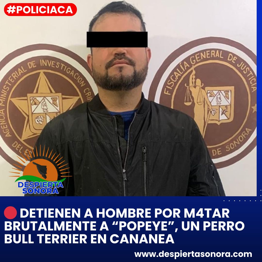 Cananea, Sonora.- Personal de la Agencia Ministerial de Investigación Criminal (AMIC) cumplimentó una orden de aprehensión en contra de Eduardo “N”, de 39 años, por su presunta responsabilidad en el delito de muerte de un animal por maltrato o crueldad, en perjuicio de un canino de raza Bull Terrier, color café con blanco, de nombre “Popeye”.