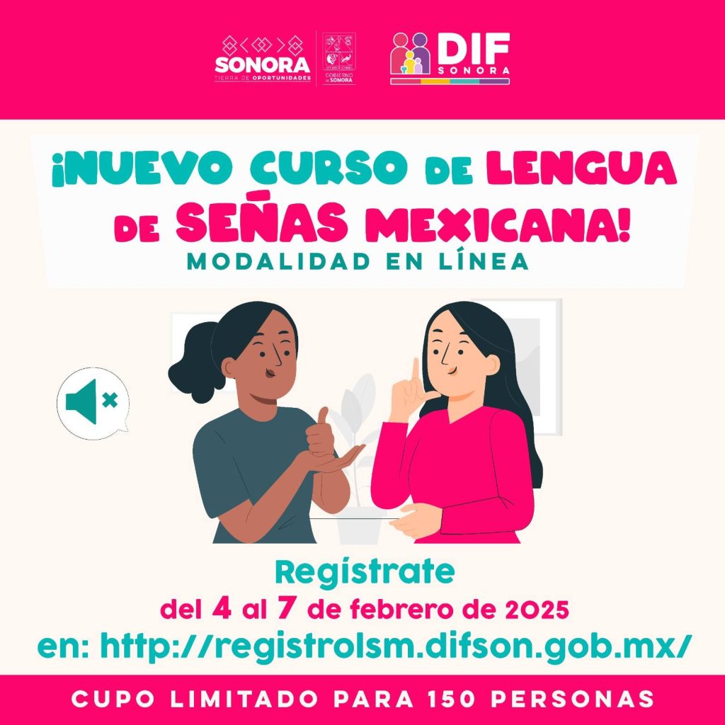 Hermosillo.- Con el compromiso de fortalecer la inclusión y eliminar las barreras de comunicación, el Sistema para el Desarrollo Integral de la Familia en la entidad (DIF Sonora) abre el registro para el Curso Básico de Lengua de Señas Mexicana (LSM) en modalidad en línea, dirigido a servidoras y servidores públicos, instituciones privadas y sociedad en general.