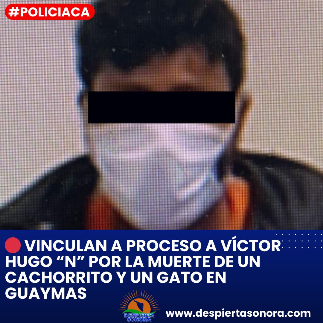 Guaymas, Sonora, 5 de febrero de 2025.- Víctor Hugo “N”, de 34 años, ante los datos de prueba presentados por la Fiscalía General de Justicia del Estado de Sonora (FGJES), quedó vinculado a proceso por el delito de crueldad contra los animales, en perjuicio de un canino, de aproximadamente 2 meses, y de un felino adulto, ambos privados de la vida.