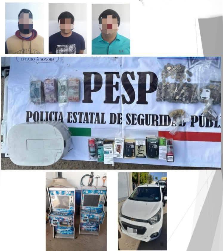 Elementos de la Policía Estatal de Seguridad Pública (PESP) y Fiscalía General de la República (FGR) lograron la detención de Randall Phillip “N”, José Ángel “N” y Luis Guadalupe “N” al asegurarle una caja color blanco para contar monedas, dos máquinas tragamonedas de color rojo, nueve cigarros eléctricos de los denominados “vapeadores”, dos juegos de llaves para cerraduras de diferentes tamaños, 15 mil 813 pesos y el vehículo tipo sedan de la marca Chevrolet en el que se trasladaba.
