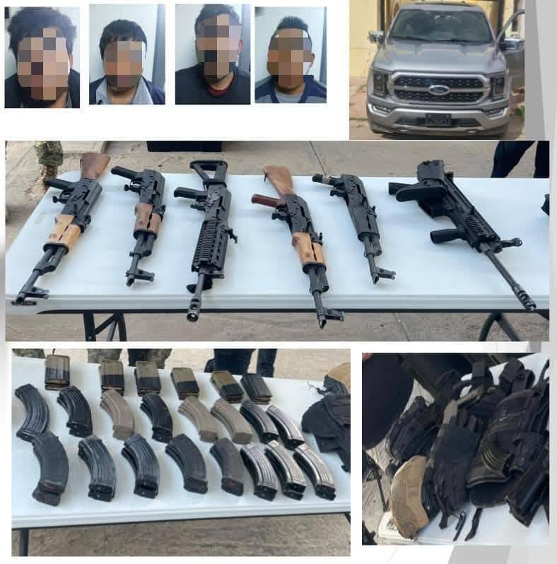 Así mismo en la colonia Deportiva detuvieron a Manuel “N”, Jesús “N”, Jesús Antonio “N” y Pedro Antonio “N” al asegurarles seis armas de fuego tipo fusil, 43 cargadores para arma de fuego tipo fusil, mil 739 cartuchos, siete chalecos balísticos, un casco balístico y un vehículo tipo pick up.