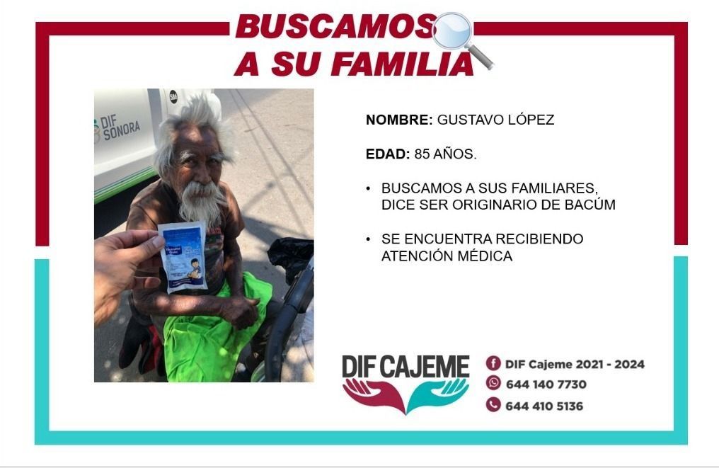 DIF Cajeme, a través del programa de Atención a Personas en situación de calle, está buscando a los familiares del Sr. Gustavo López, de 85 años, quien es originario del Municipio de Bacúm. 🙏