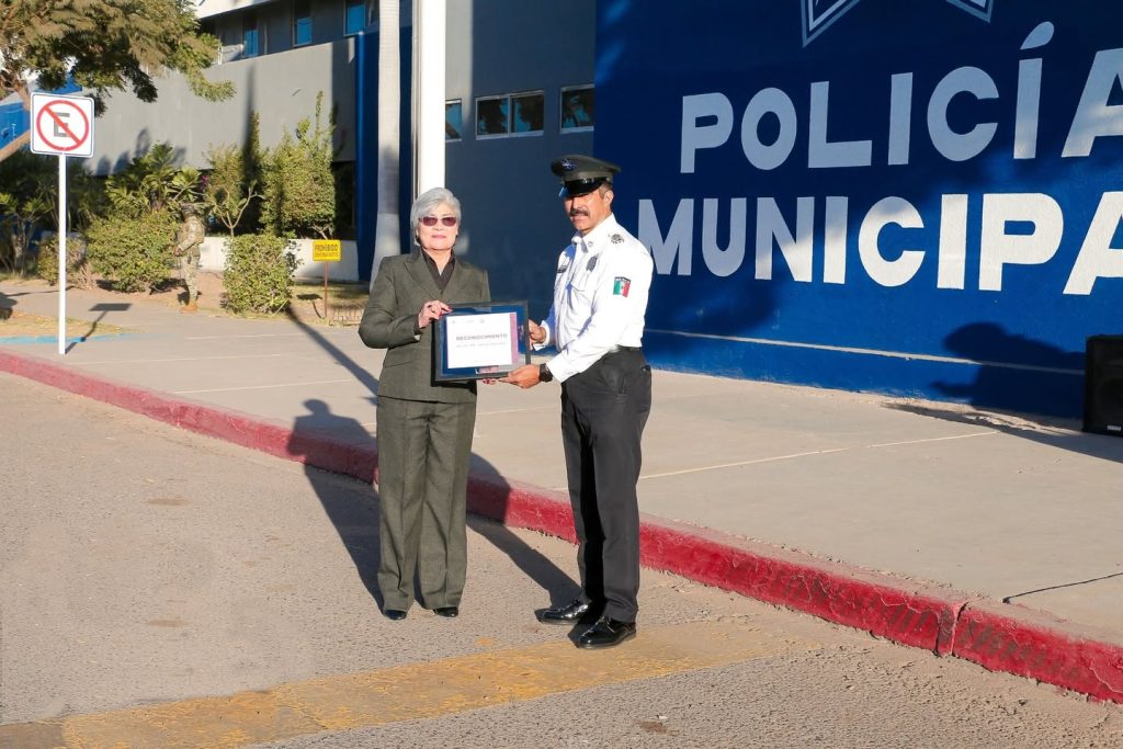Luego de realizarse los honores a la Bandera de México, el Secretario de la SSPM, Claudio Cruz Hernández, entregó un reconocimiento a la Directora de la Técnica 56, María Dolores Gallegos Castro y a las y los estudiantes en agradecimiento por su asistencia y participación en la ceremonia.