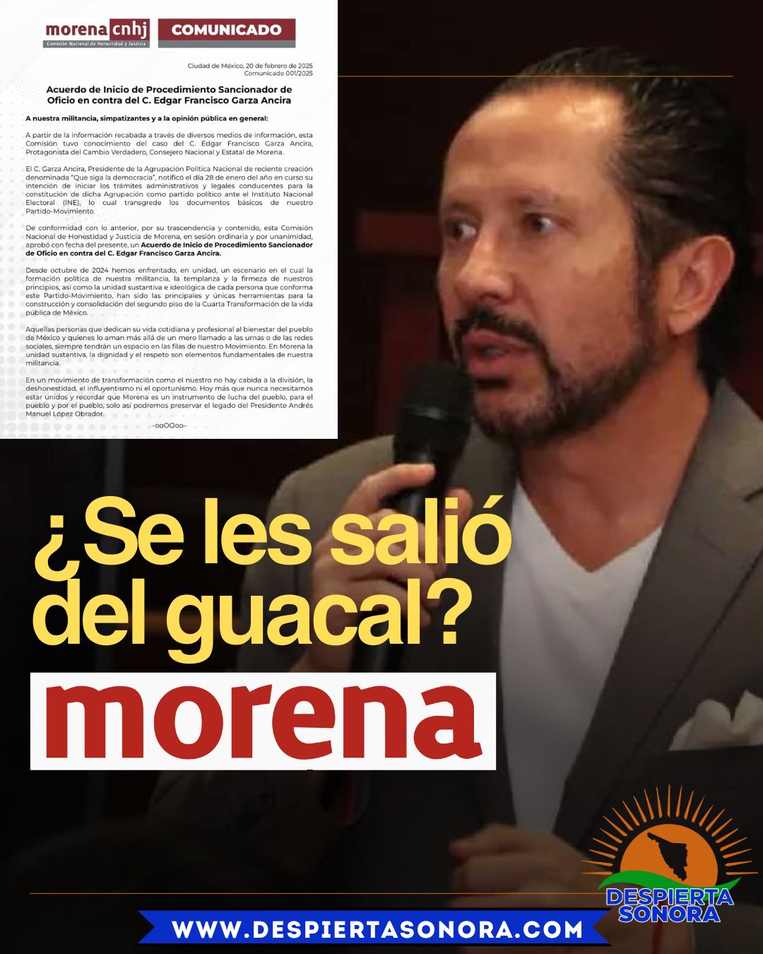 La Comisión Nacional de Honestidad y Justicia (CNHJ) de #Morena abrió un procedimiento sancionador de oficio en contra de Francisco Garza Ancira, quien es militante de dicha fuerza política y busca crear un nuevo #partido, llamado ‘Que siga la Democracia’ y cuyos trámites de registro ya presentó ante el Instituto Nacional Electoral (INE).
