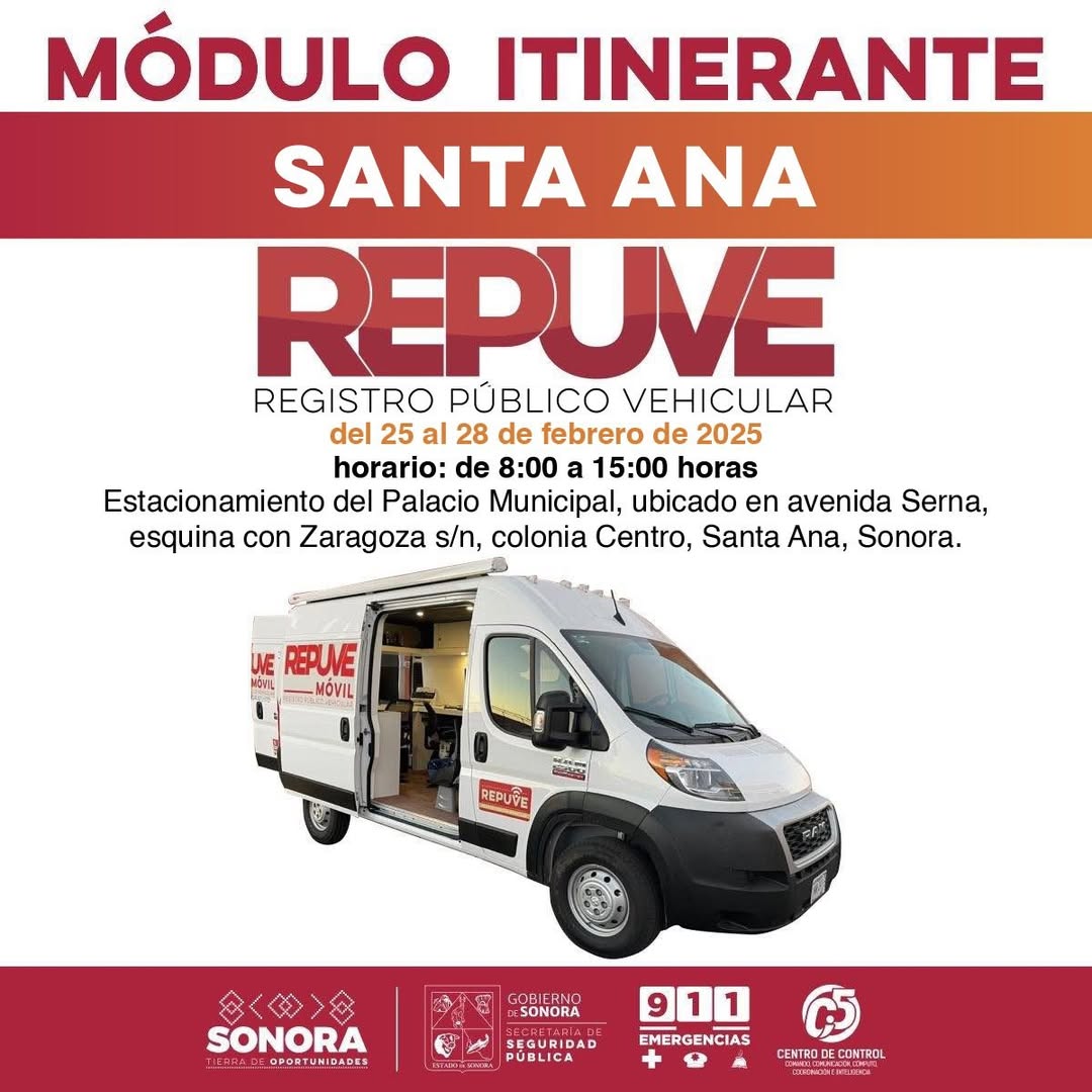 Del 25 al 28 de febrero el módulo itinerante del Registro Público Vehicular (Repuve) estará instalado en Santa Ana como parte de las acciones para apoyar a la ciudadanía interesada en regularizar sus vehículos usados de procedencia extranjera.