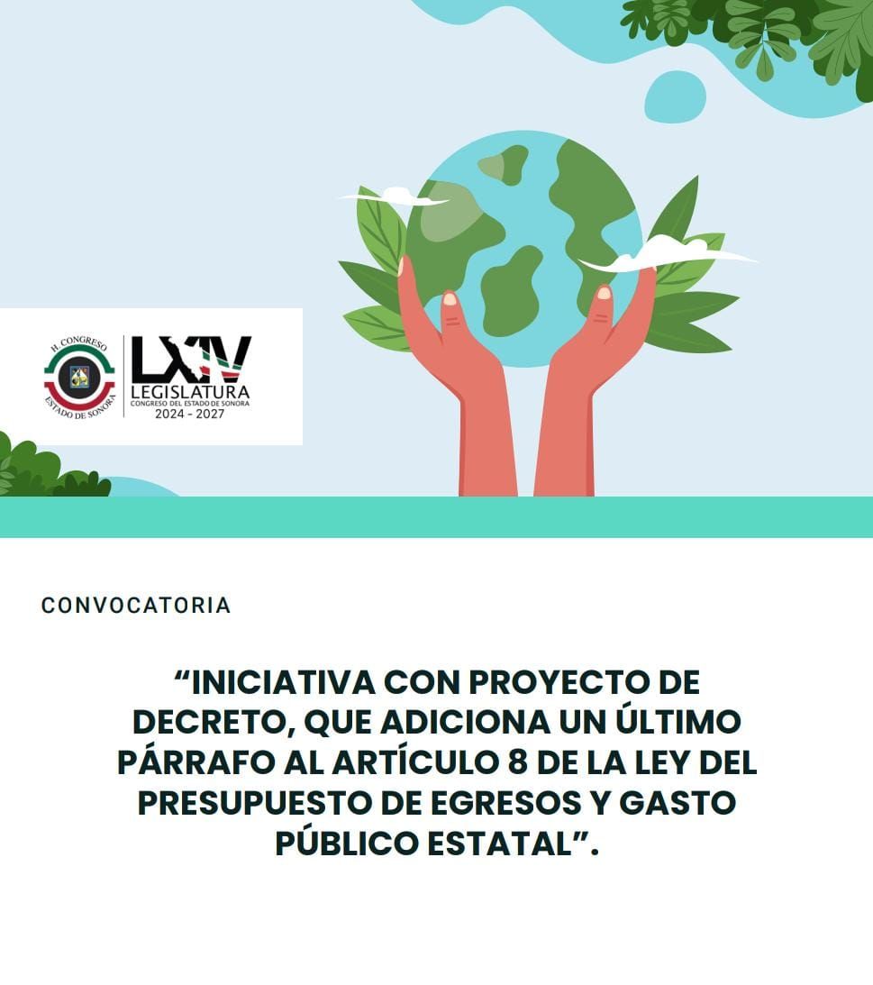 Hermosillo, Sonora; 26 de febrero de 2025.– Con el fin de socializar la iniciativa que modifica la Ley de Presupuesto de Egresos y Gasto Público Estatal en materia de mitigación de los efectos del cambio climático, el Congreso de Sonora, a través de la Comisión de Hacienda, invitó a la ciudadanía a participar en el foro de consulta pública que se llevará a cabo el próximo jueves 27 de febrero.