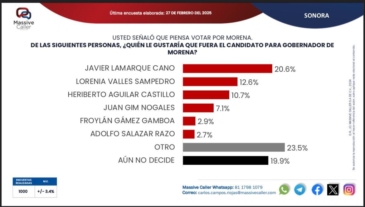 El actual alcalde de #Cajeme mantiene la ventaja sobre los senadores Lorenia Valles y Heriberto Aguilar; también sobre el alcalde de Nogales, Juan Gym; y los secretarios de Educación Froylán Gámez y de Gobierno Adolfo Salazar.
