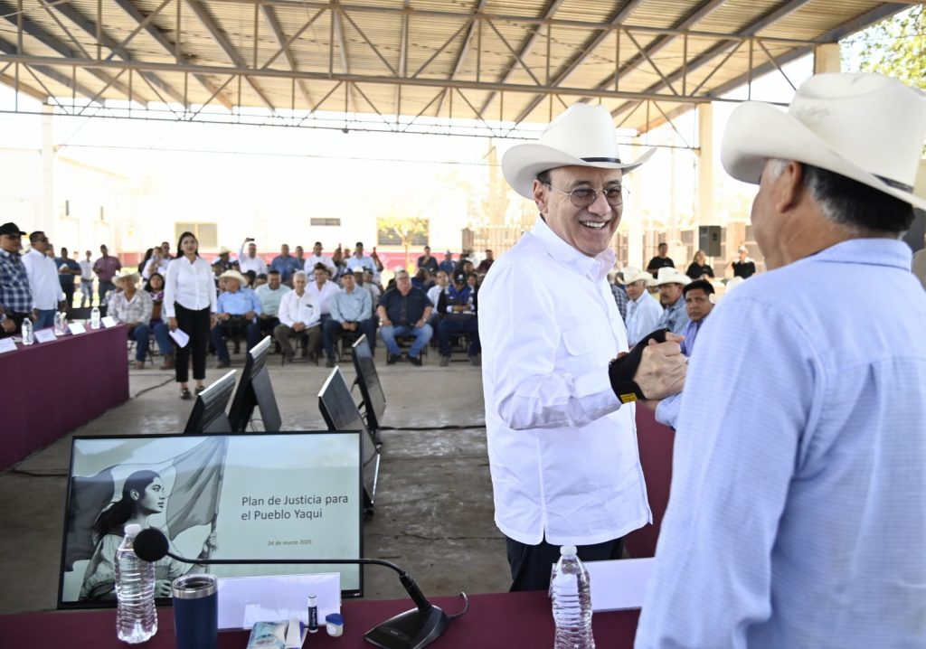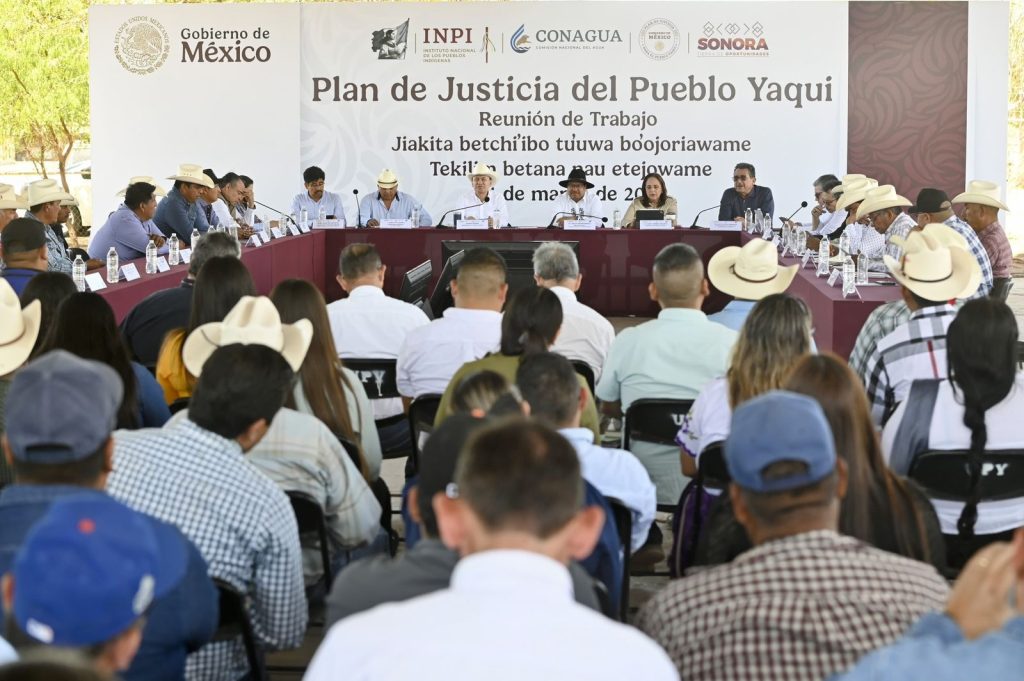 - Durante el encuentro se refrendó el compromiso del Gobierno de México, encabezado por la presidenta Claudia Sheinbaum para garantizar la continuidad del Plan de Justicia Yaqui. Uno de los proyectos clave es la rehabilitación y ampliación del Distrito de Riego 018, el cual registra un 94 por ciento de avance físico, asegurando el acceso al agua para la producción agrícola y el bienestar de las comunidades yaquis.