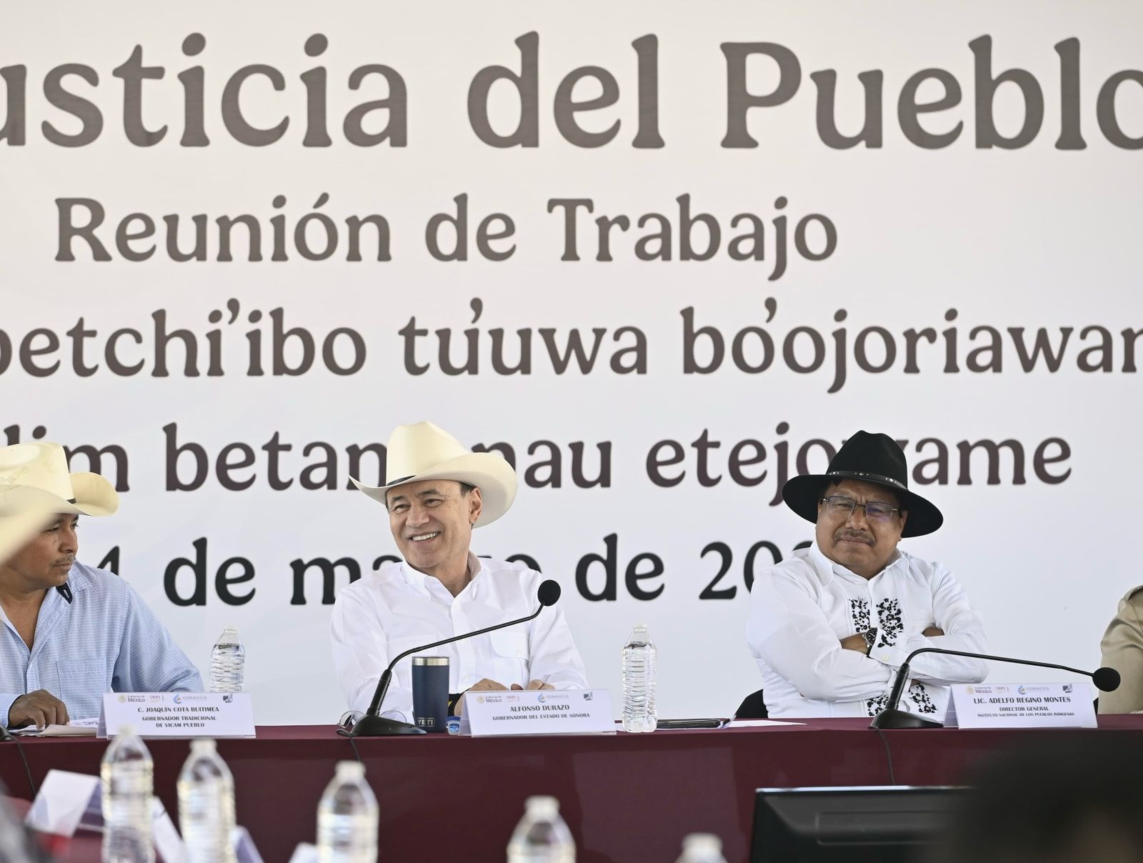 Vícam, municipio de Guaymas, Sonora; 24 de marzo de 2025.- Como parte del compromiso del Gobierno de Sonora y el respaldo de la presidenta Claudia Sheinbaum Pardo al Plan de Justicia para el Pueblo Yaqui, el gobernador Alfonso Durazo Montaño sostuvo una reunión con las autoridades tradicionales yaquis y la Comisión Jiaki del Agua para dar seguimiento a las acciones en materia de suministro de agua y el desarrollo de la comunidad.