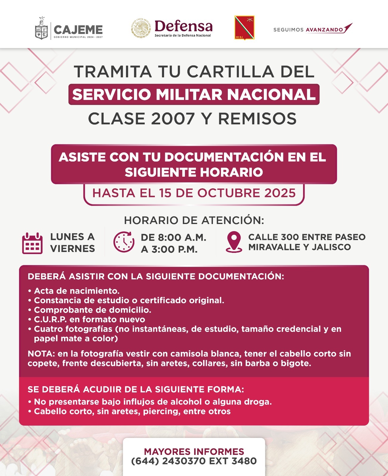 La Junta Municipal de Reclutamiento informa a la ciudadanía que continúa abierto el trámite para obtener la Cartilla del Servicio Militar Nacional para la Clase 2007 y remisos.