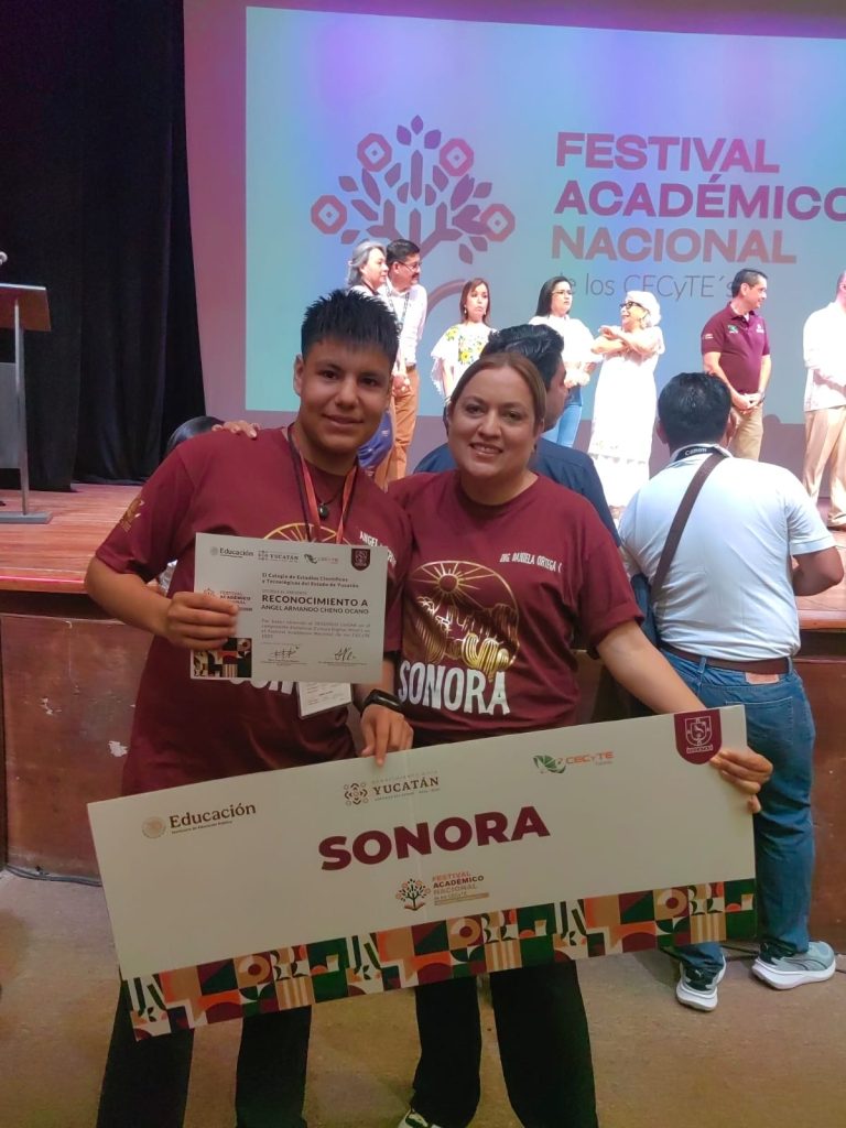 Hermosillo, Sonora; 6 de abril de 2025.- El alumno Ángel Armando Cheno Ocaño, del Colegio de Estudios Científicos y Tecnológicos del Estado de Sonora (Cecyte), plantel Esqueda, obtuvo el segundo lugar en el Festival Nacional Académico de los Cecyte’s 2025, destacó Blanca Aurelia Valenzuela.
