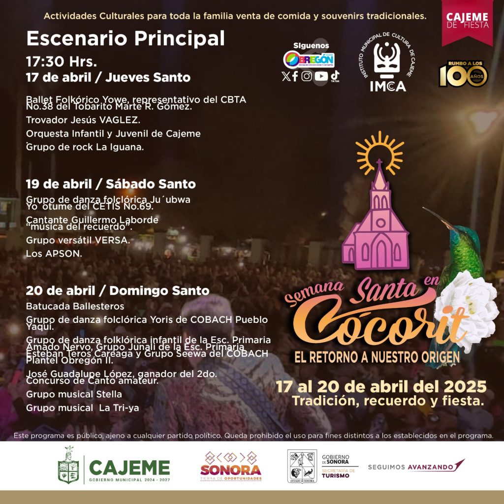Asimismo, el Municipio de Cajeme invita a la comunidad y visitantes a disfrutar de las festividades de la Semana Santa 2025 en Cócorit, que se celebrarán del 17 al 20 de abril bajo el lema “El retorno a nuestro origen”, durante estos días, las y los asistentes podrán disfrutar de animación artística, conciertos, danza regional, talleres, gastronomía tradicional, paseos en el Yaqui Tour y calandrias, así como de la tradición Yaqui que estará presente con los rituales en el Conti de la comunidad, respetando sus usos y costumbres, entre otras actividades culturales, además, el programa incluye la presentación de obras teatrales y el emocionante concierto de Los Apson, entre otras sorpresas.