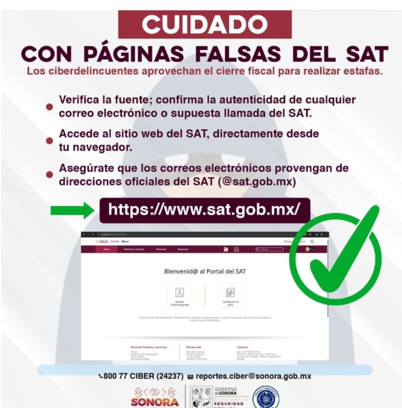 Hermosillo, Sonora.- Para evitar que contribuyentes y el público en general sean víctimas de estafas y fraudes a través de páginas web y correos electrónicos que suplantan la identidad del Sistema de Administración Tributaria (SAT), la Unidad Cibernética de la Secretaría de Seguridad Pública (SSP) de Sonora recomendó extremar las medidas de prevención.