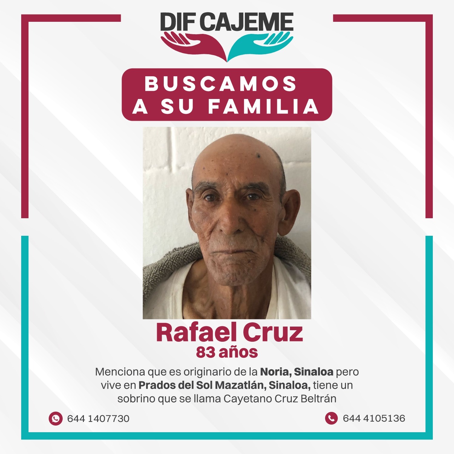 El Sr. Rafael Cruz, de 83 años, se encuentra bajo el resguardo del DIF Cajeme. Es originario de La Noria, Sinaloa, y recuerda que vivía en Prados del Sol, Mazatlán, Sinaloa.