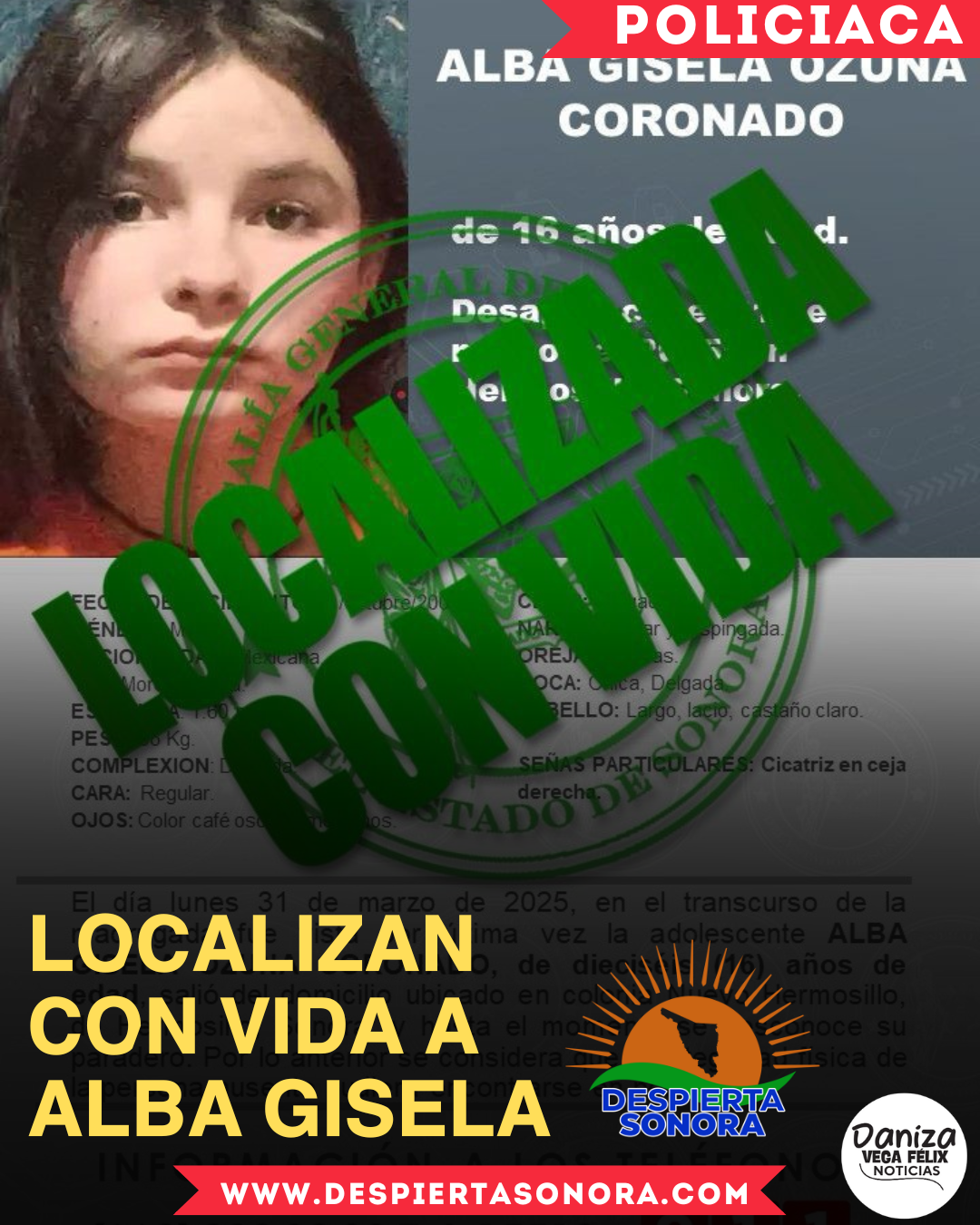 Agradecemos a todos su valiosa colaboración por difundir y contribuir en la localización de ALBA GISELA OZUNA CORONADO, de 16 años de edad, quien salió por cuenta propia de su domicilio y nunca estuvo en peligro