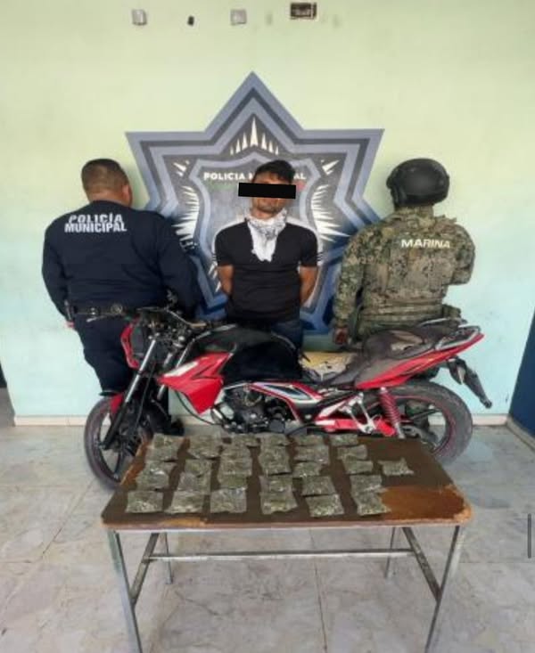 En una acción coordinada entre elementos de la Secretaría de Marina y la Secretaría de Seguridad Pública Municipal, se logró la detención de un individuo que portaba presunta droga, en hechos ocurridos en las calles 200 y Tlaxcala, colonia Centro.