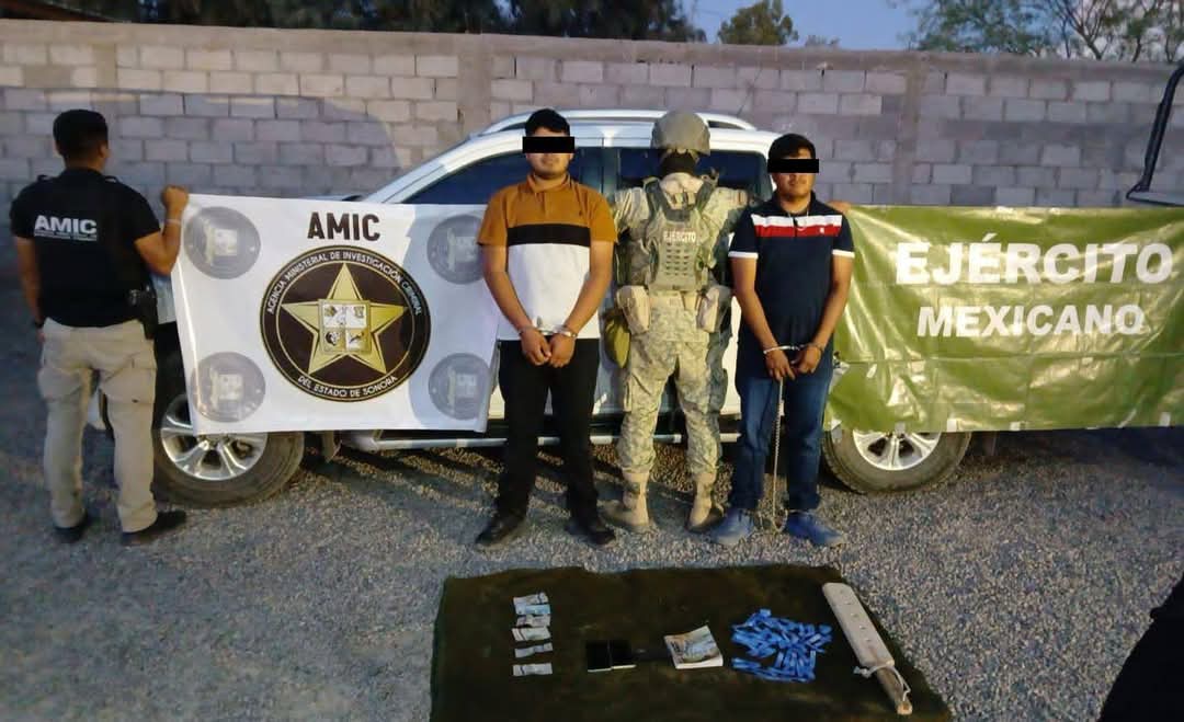 Caborca, Sonora, 26 de abril de 2025.- La Agencia Ministerial de Investigación Criminal (AMIC) y la Secretaría de la Defensa Nacional (DEFENSA) lograron mediante un operativo coordinado la captura de dos masculinos en posesión de droga, esto en la Calzada 6 de Abril de la colonia Pueblo Viejo en Caborca, Sonora.