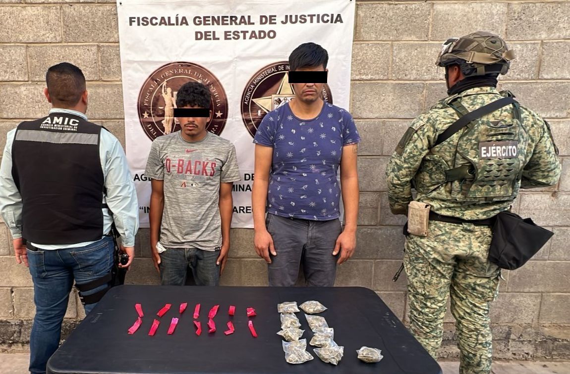 En Hermosillo, AMIC y DEFENSA realizaron un cateo en un domicilio ubicado en la colonia Floresta; fueron detenidos Jesús Alexis “N”, de 27 años, quien cuenta con antecedentes por robo en 2020 y Germán Bladimir “N”, de 32 años, con historial de narcomenudeo en 2019 y delitos federales en 2011 y 2018.