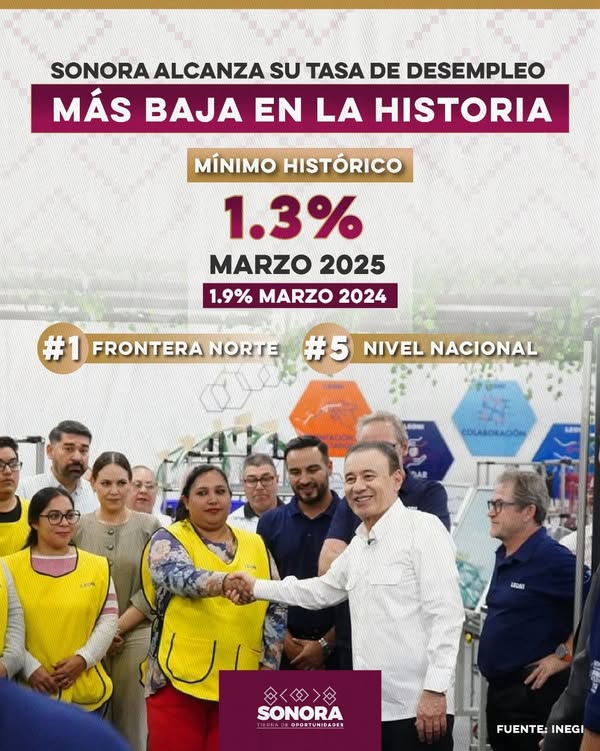 Hermosillo, Sonora; 28 de abril de 2025.- Sonora alcanzó en marzo de 2025 su tasa de desempleo más baja desde que se tiene registro, con un mínimo histórico de 1.3 %, de la población desocupada, informó el gobernador Alfonso Durazo Montaño, de acuerdo con datos del Instituto Nacional de Estadística y Geografía (INEGI).