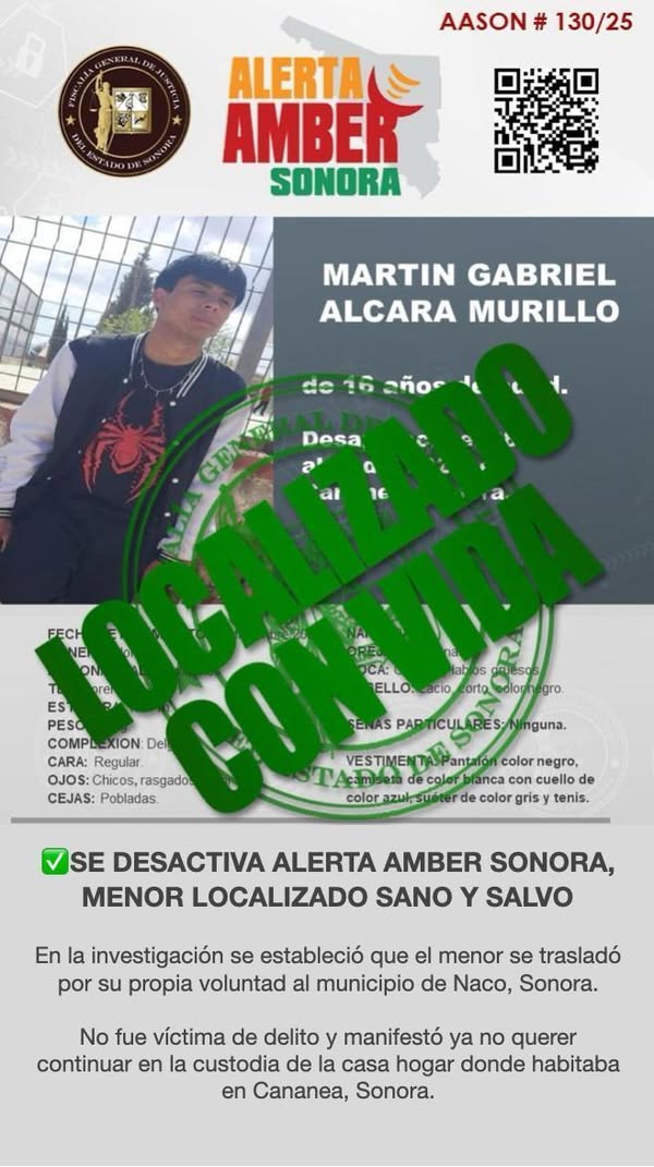 Martin Gabriel Alcara Murillo, de 16 años de edad, fue localizado sano y salvo
