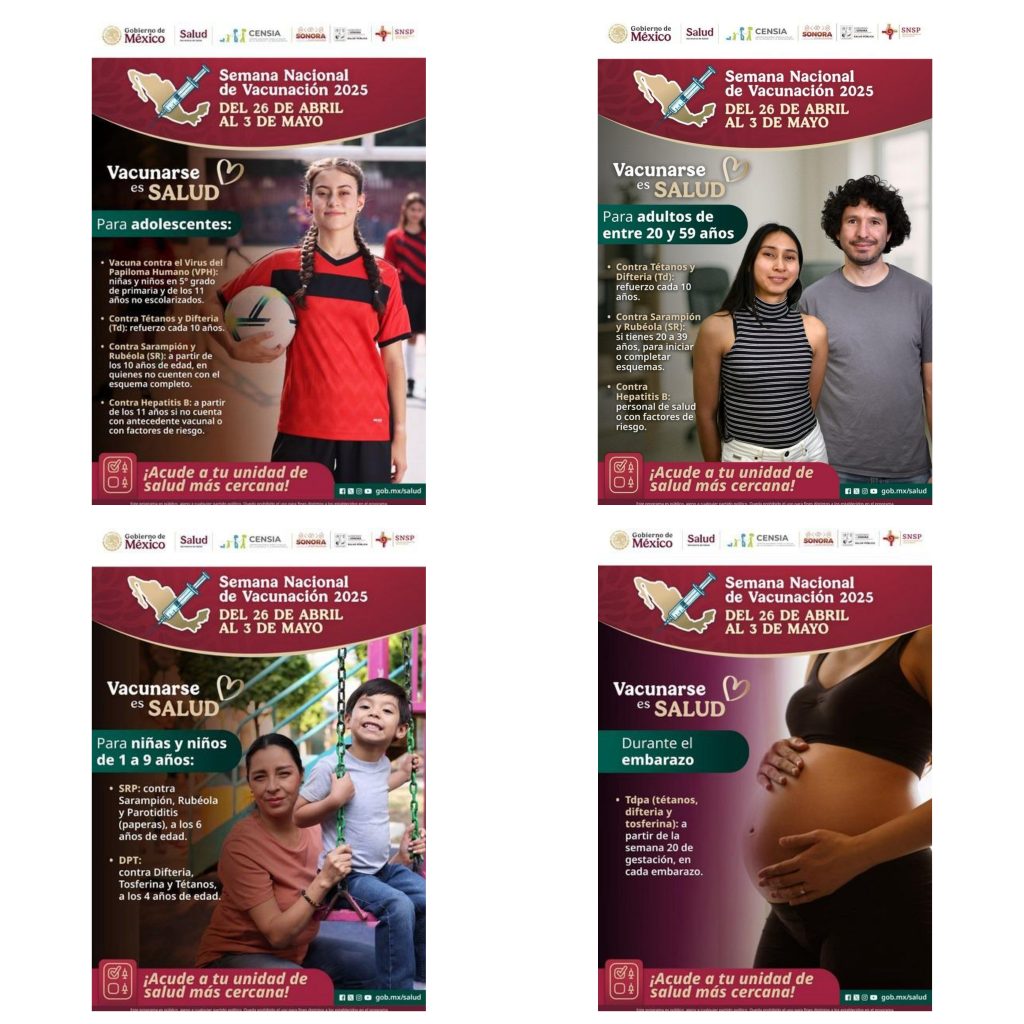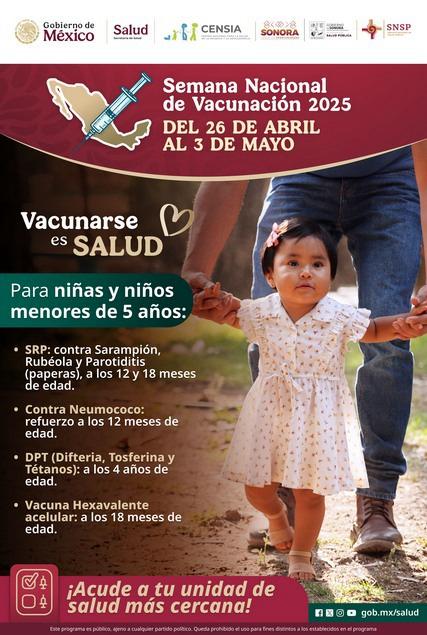 Hermosillo, Sonora; 2 de mayo de 2025.- La Secretaría de Salud (SSP) recordó que este sábado 3 de mayo concluye la Primera Semana Nacional de Vacunación, por lo que hizo un llamado a la población a acudir a los módulos fijos y semifijos, así como a las unidades médicas y hospitales de cualquier institución pública de salud, para aplicarse las vacunas correspondientes o completar su esquema de inmunización.