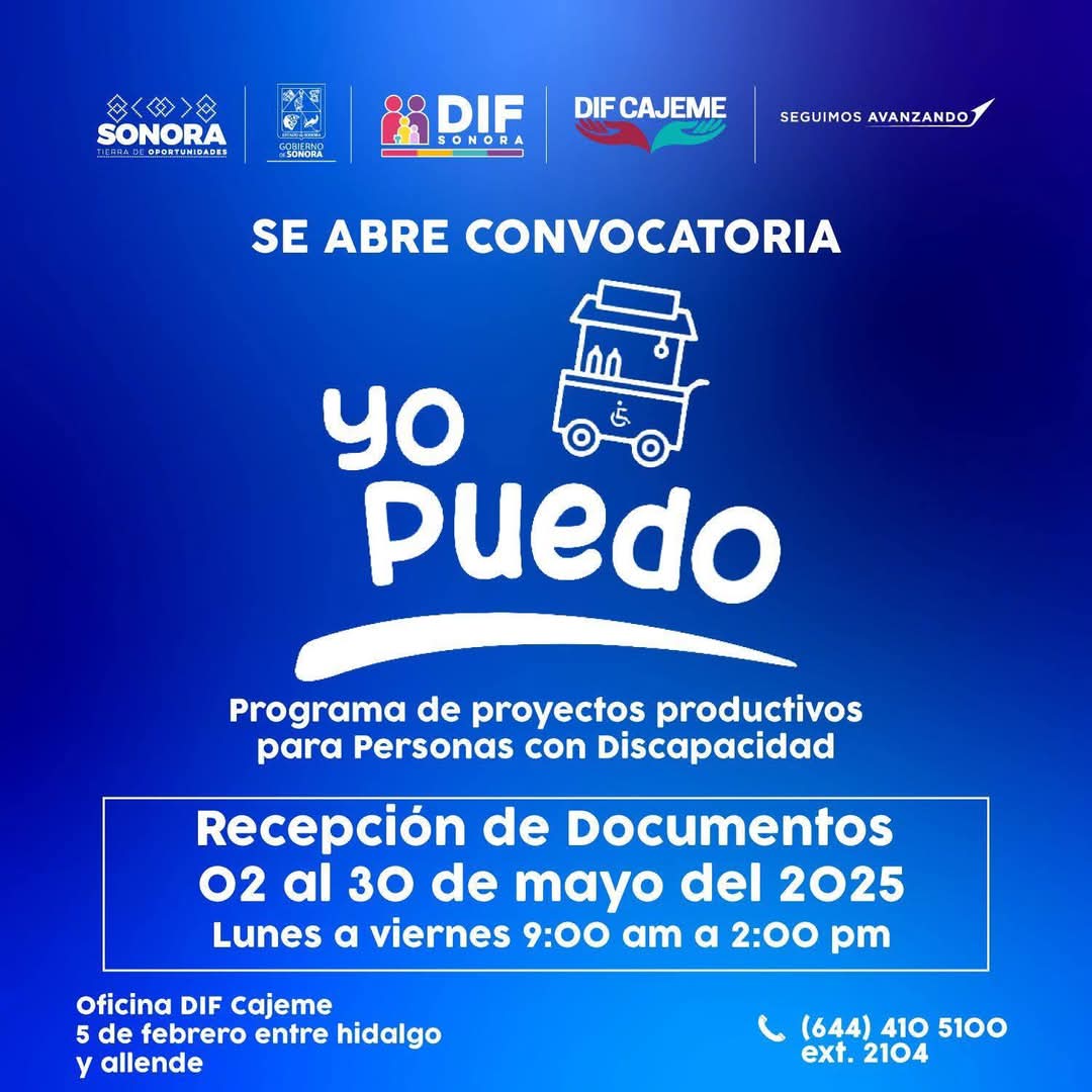 En un esfuerzo por impulsar la inclusión, la autonomía y el desarrollo económico de las personas con discapacidad, el Sistema DIF Cajeme, en coordinación con DIF Sonora, anuncia la apertura de la convocatoria del programa “Yo Puedo”, dirigida a quienes deseen emprender o fortalecer un proyecto productivo.