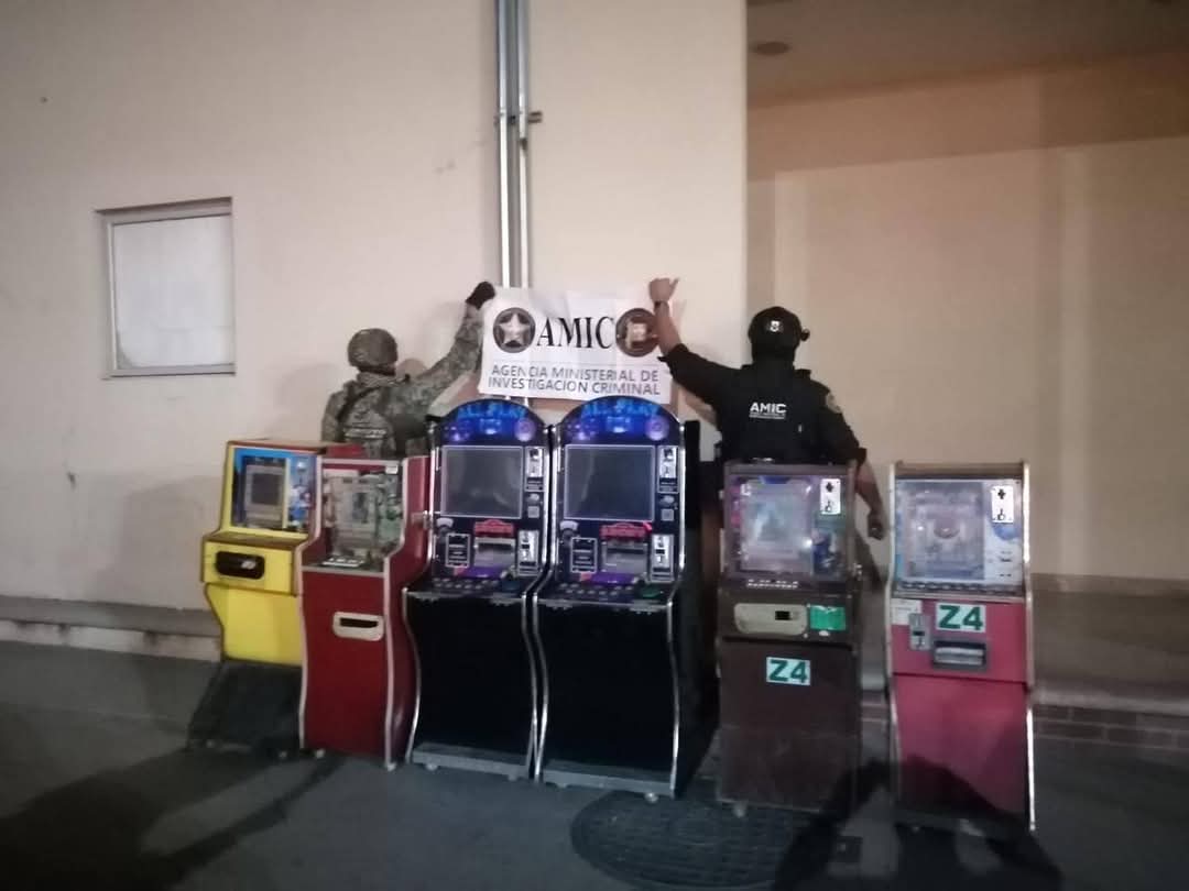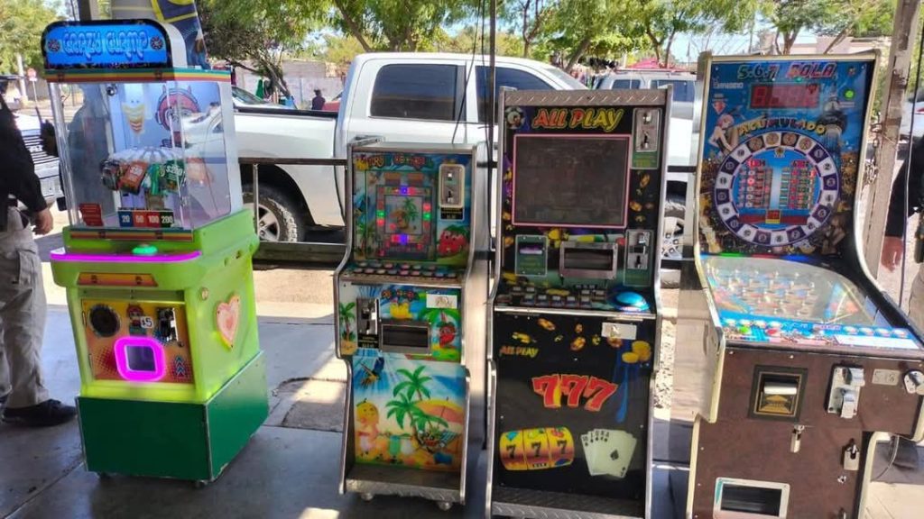 Durante actos de investigación y recorridos de reconocimiento realizados en una tienda de abarrotes ubicada en la colonia Sóstenes Valenzuela, así como en un local comercial sobre la calle California, en la colonia Centro, fueron aseguradas 6 máquinas tragamonedas localizadas sobre la banqueta de dichos negocios.