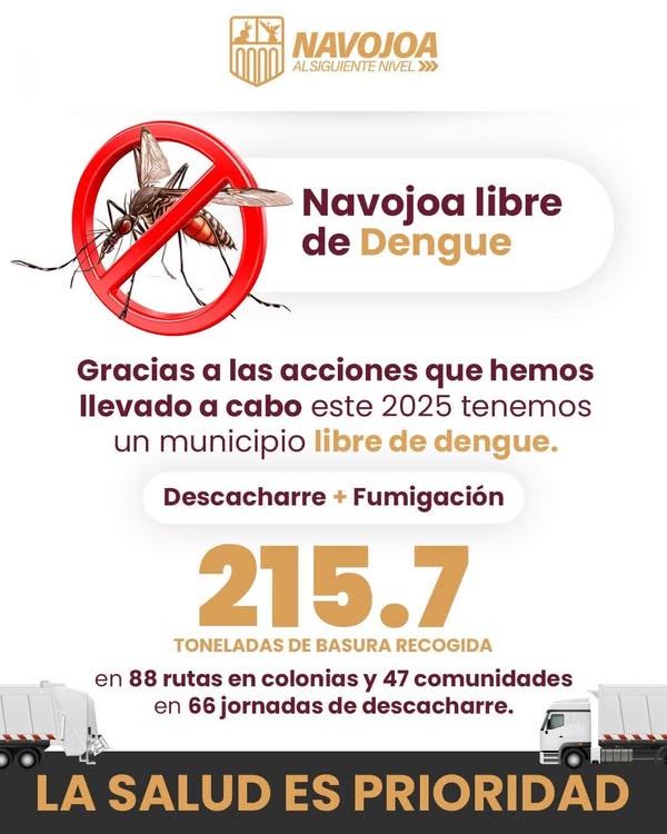 A través de sus redes sociales el alcalde de Navojoa, Jorge Alberto Elías Retes, celebró que gracias a las acciones de limpieza el municipio se encuentra con cero casos de dengue en esta temporada.