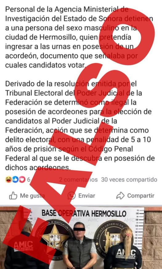 En relación a la información que circula en una cuenta de la red social Facebook sobre la detención de una persona en las urnas, se informa que el contenido es *FALSO*. Por lo que se invita a hacer caso omiso de este tipo de publicaciones e informarse con medios establecidos u oficiales.