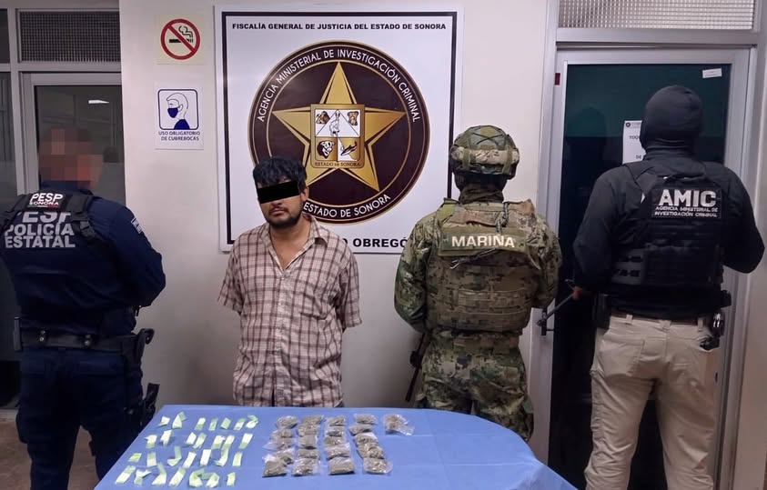 Cajeme, Sonora, 3 de junio 2025.- En operativo coordinado entre la Agencia Ministerial de Investigación Criminal (AMIC), la Policía Estatal de Seguridad Pública (PESP) y Secretaría de Marina Arma de México (SEMAR), se logró la captura de Luis Alberto “N”, de 36 años, quien estaba acompañado de un menor, por su probable responsabilidad en delitos contra la salud.