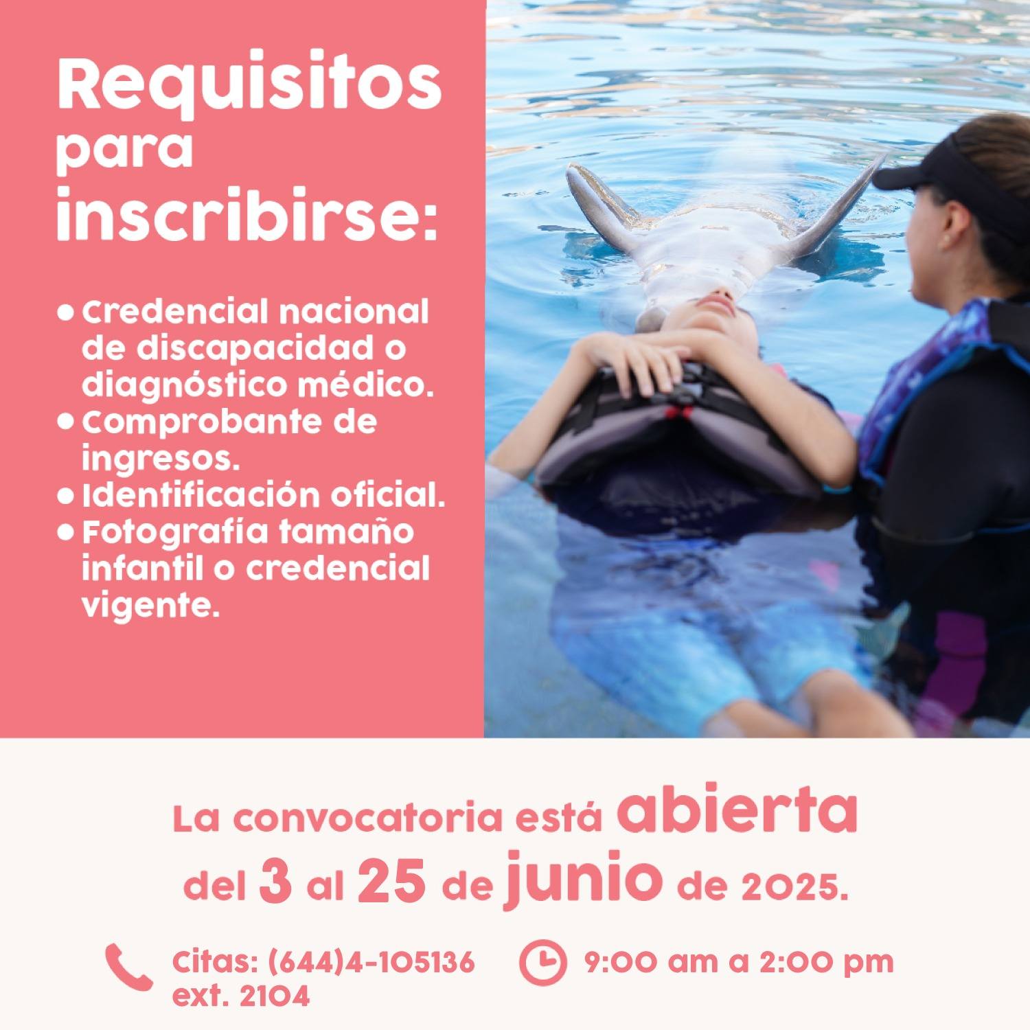 El Sistema para el Desarrollo Integral de la Familia (DIF) Cajeme en coordinación con el Sistema DIF Sonora informa a la comunidad que a partir de hoy se encuentra abierta la convocatoria para acceder al programa de terapia asistida con delfines, completamente gratuita, dirigida a personas con autismo, parálisis cerebral infantil y discapacidad intelectual.
