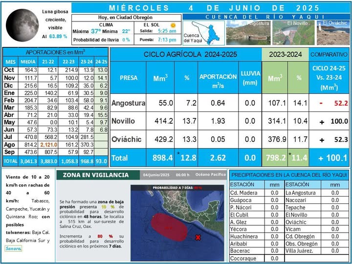 ➡️ REPORTE DEL DISTRITO DE RIEGO DEL RÍO YAQUI AL 04 DE JUNIO DE 2025