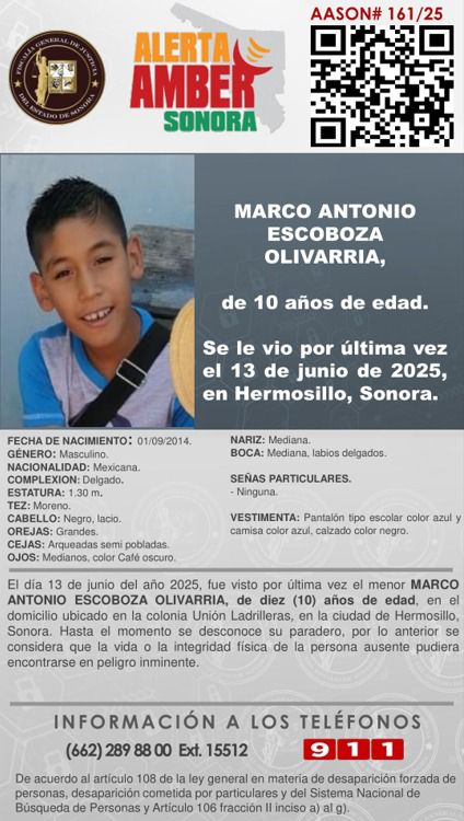 🚨 SE ACTIVA ALERTA AMBER SONORA PARA BÚSQUEDA y LOCALIZACIÓN DEL MENOR MARCO ANTONIO ESCOBOZA OLIVARRÍA , de 10 años de edad; visto por última vez el 13 de junio de 2025 en Hermosillo, Sonora. 🚨