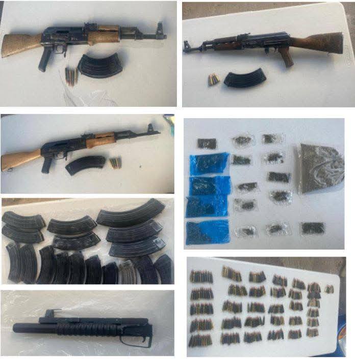 Además, decomisaron siete armas largas y dos armas cortas, 606 cartuchos y 35 cargadores, 651 dosis de droga sin especificar, 124 envoltorios de cristal y 49 de marihuana. Adicionalmente se confiscaron 25 máquinas tragamonedas, dos cámaras tipo “parásito”, dos chalecos balísticos y 2 mil 527 pesos en efectivo.