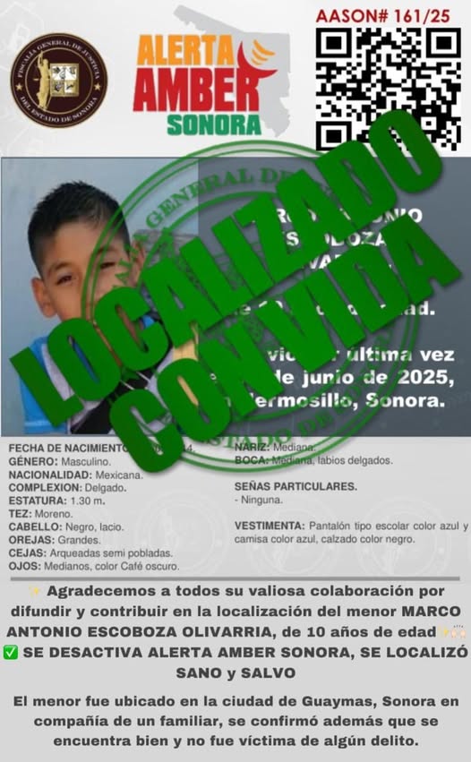 El menor fue ubicado en la ciudad de Guaymas, Sonora en compañía de un familiar, se confirmó además que se encuentra bien y no fue víctima de algún delito
