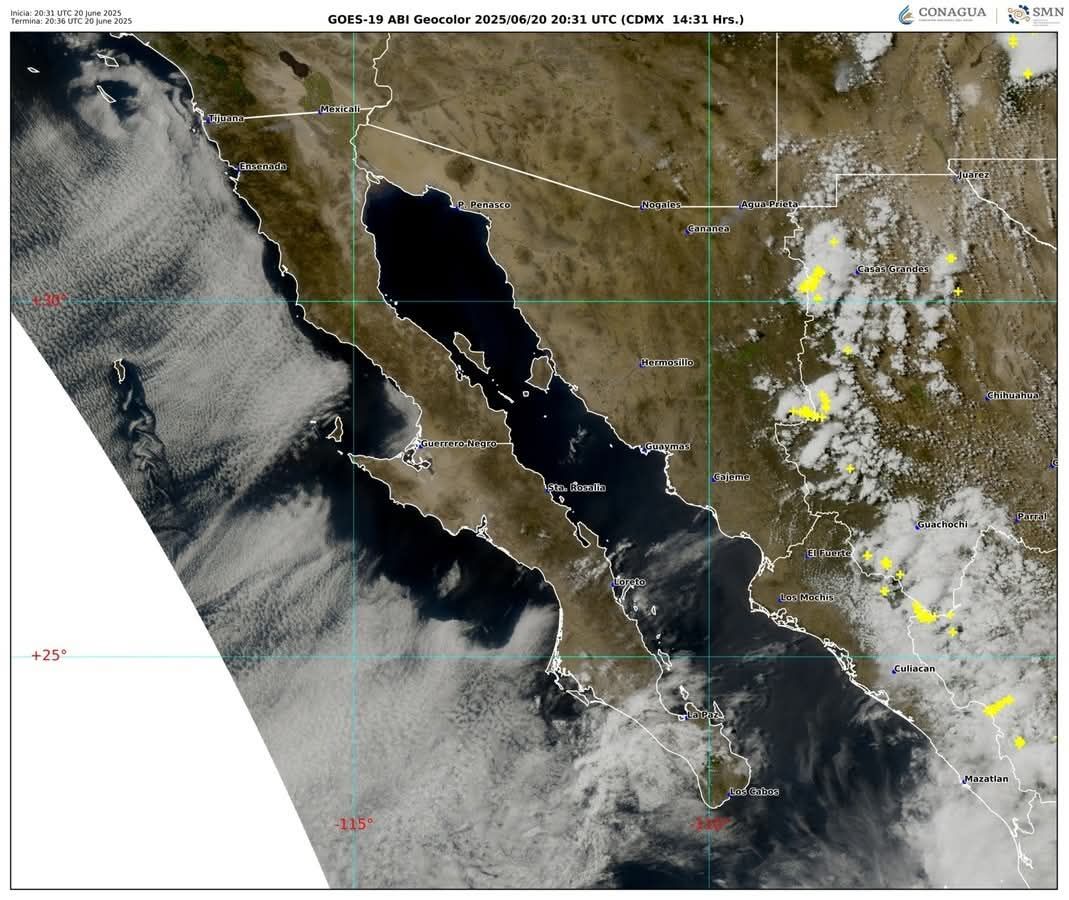 En imagen satelital se muestra el desarrollo de nubosidad vertical sobre la región del oriente, se prevé que durante las próximas horas se aumente el potencial de tormentas sobre la zona serrana de Sonora.