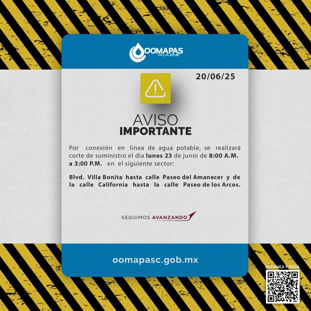 AVISO DEL OOMAPAS DE CAJEME DE CORTE DE AGUA PROGRAMADO POR TRABAJOS DE INTERCONEXI脫N
