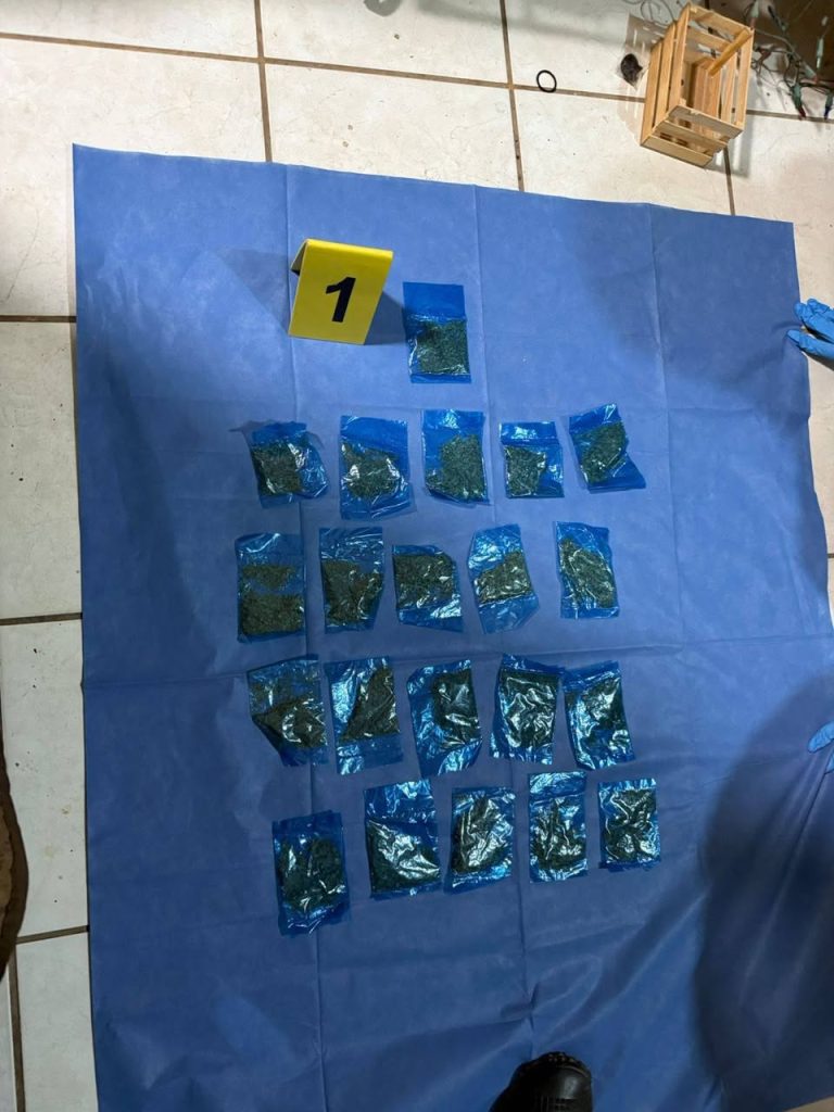 Durante la acción, derivada de una orden judicial, se aseguraron diversos indicios materiales relacionados con actividades delictivas. En el lugar se localizaron 21 envoltorios con sustancia vegetal verde y seca, cuya toxicología preliminar indica características compatibles con marihuana.