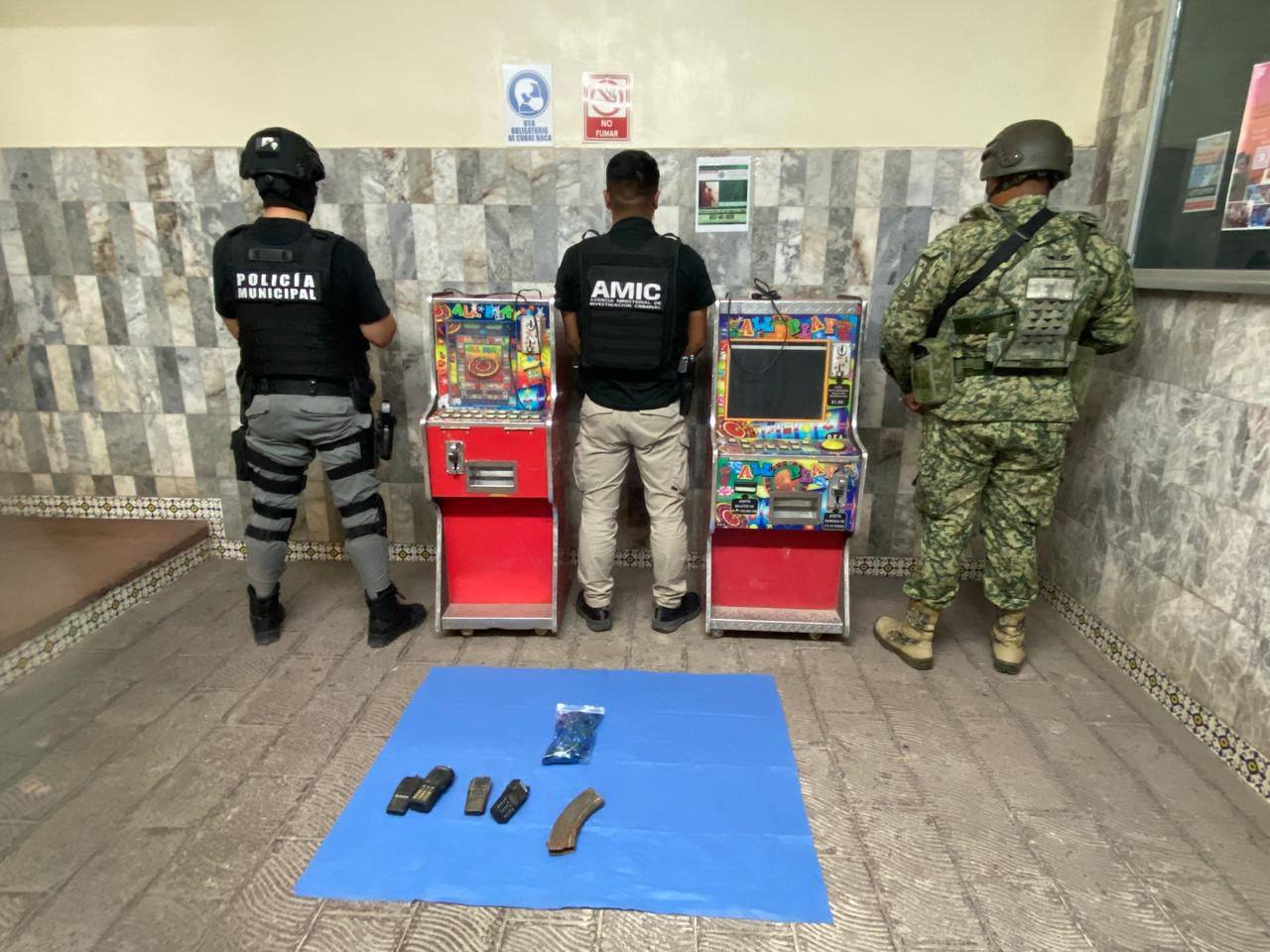 Asimismo, se incautaron dos máquinas tragamonedas ilegales, un cargador para arma tipo AK-47 y cuatro radios portátiles, los cuales podrían tener relación con operaciones vinculadas al crimen organizado.