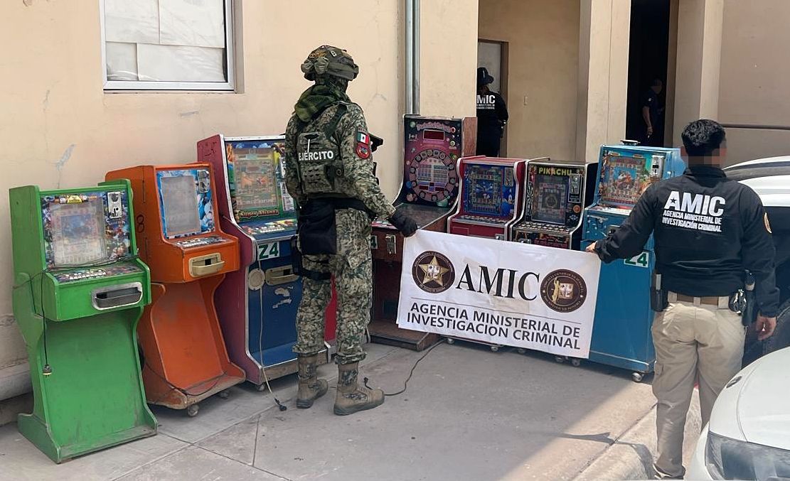 Cajeme, Sonora, 24 de junio de 2025.- En operativo conjunto entre elementos de la Agencia Ministerial de Investigación Criminal (AMIC) y la Secretaría de la Defensa Nacional (DEFENSA), se logró el aseguramiento de ocho máquinas tragamonedas en dos establecimientos comerciales en Ciudad Obregón.