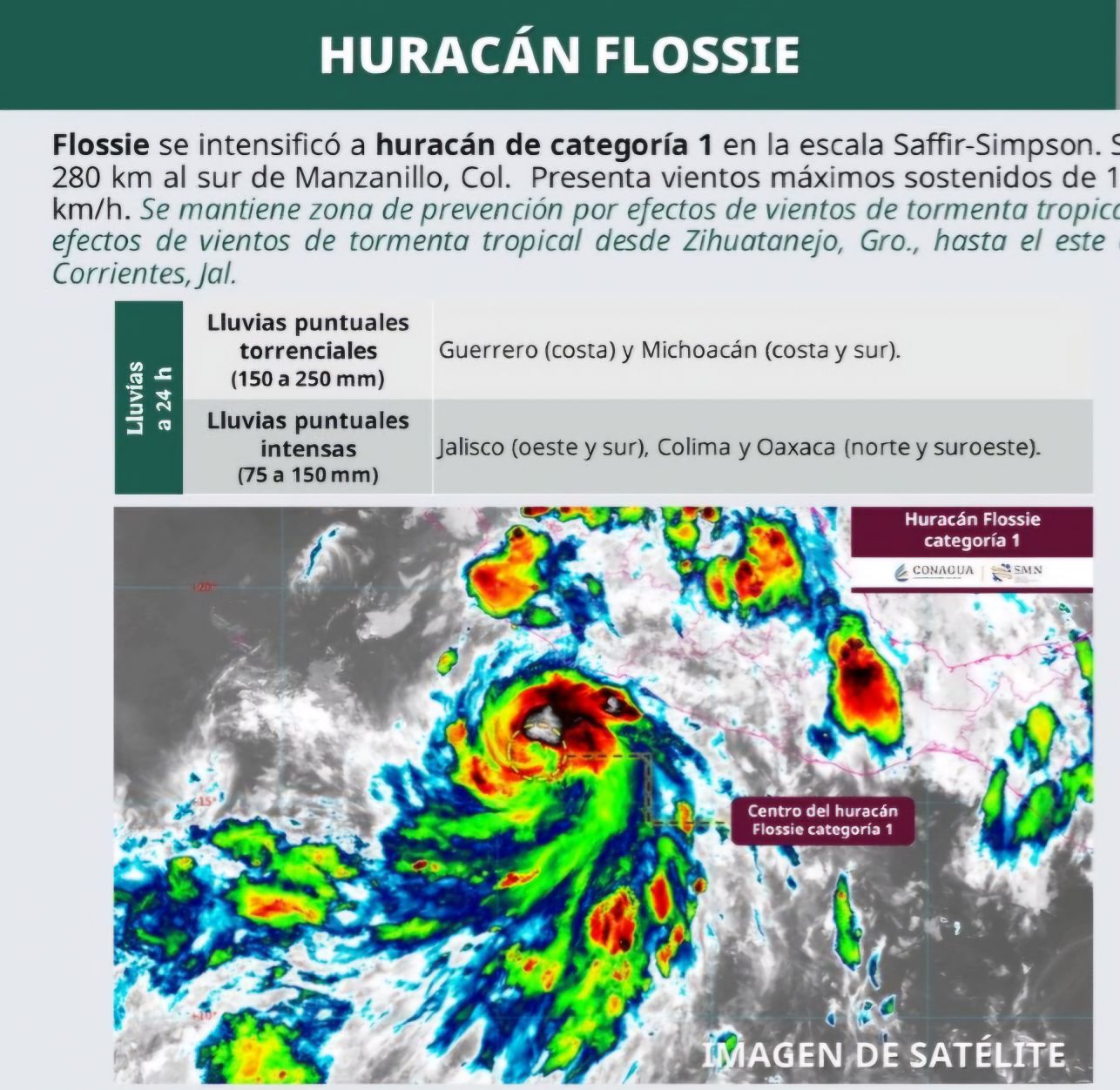 La Coordinación Nacional de Protección Civil (CNPC), de la Secretaría de Seguridad y Protección Ciudadana (SSPC), informa que el sistema ciclónico Flossie se ha intensificado a huracán categoría 1 en la escala Saffir-Simpson, según el más reciente reporte del Servicio Meteorológico Nacional (SMN).