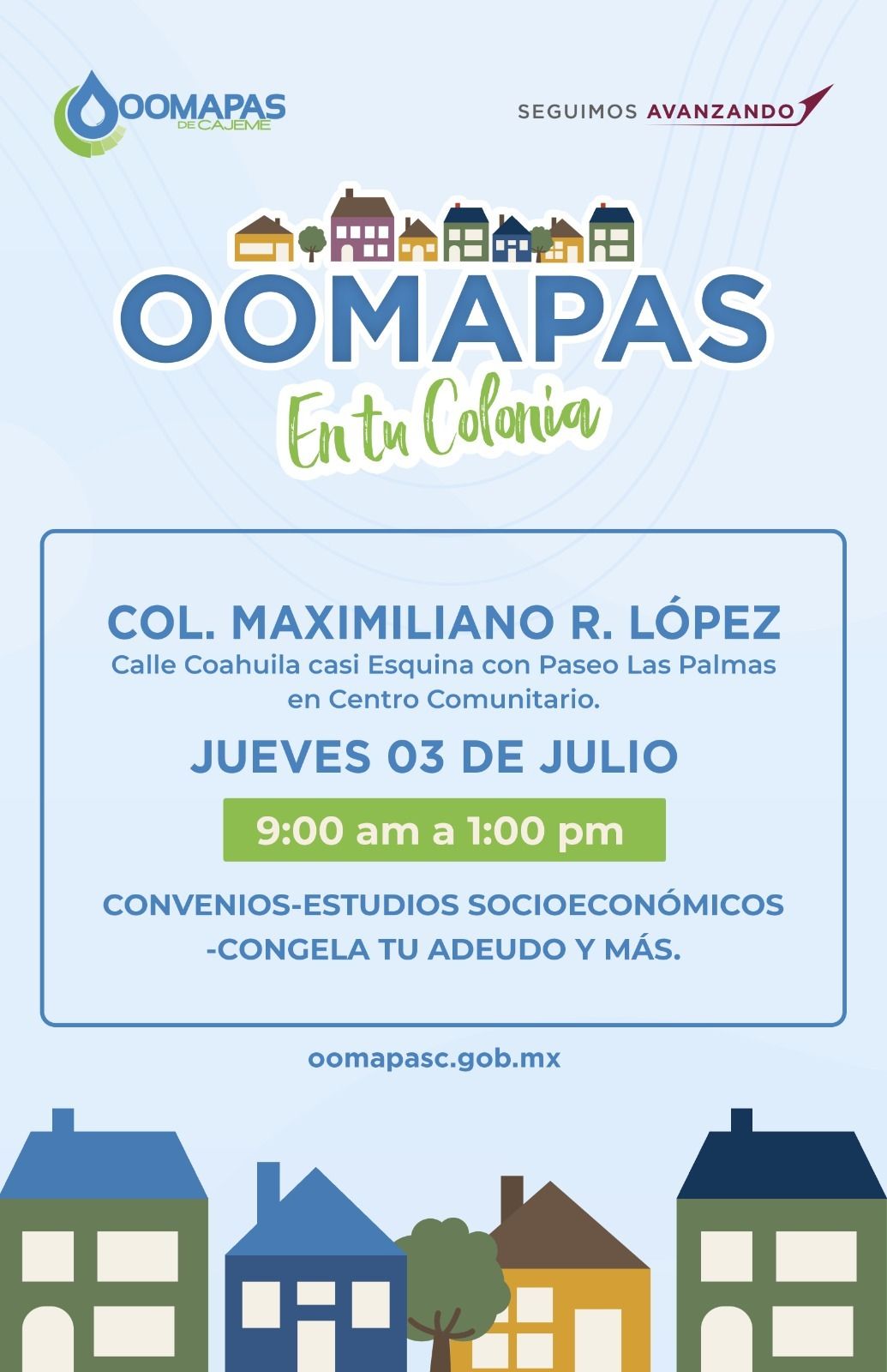 Este JUEVES estarán en la COLONIA MAXIMILIANO R. LÓPEZ con nuestro módulo móvil para pago de recibo de agua, aclaraciones y convenios de pago.
