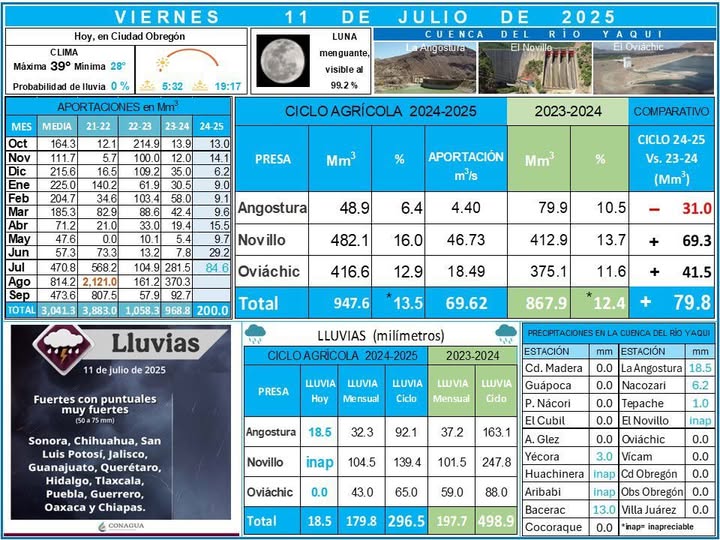 REPORTE DEL DISTRITO DE RIEGO DEL RÍO YAQUI AL 11 DE JULIO DE 2025 Angostura 6.4% Novillo 16% Oviáchic 12.9% #𝗗𝗘𝗦𝗣𝗜𝗘𝗥𝗧𝗔𝗦𝗢𝗡𝗢𝗥𝗔 Navegación de entradas En Cajeme dice el PRI que está construyendo el presente y futuro del partido, ¿qué opinas? Culmina con éxito campamento de verano deportivo y recreativo 2025