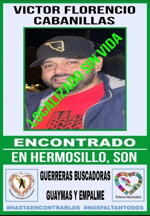 El colectivo de Guerreras Buscadoras dió a conocer que el guaymense Víctor Florencio Cabanillas, fue localizado sin vida en su jornada de busqueda en un predio de #Hermosillo.
