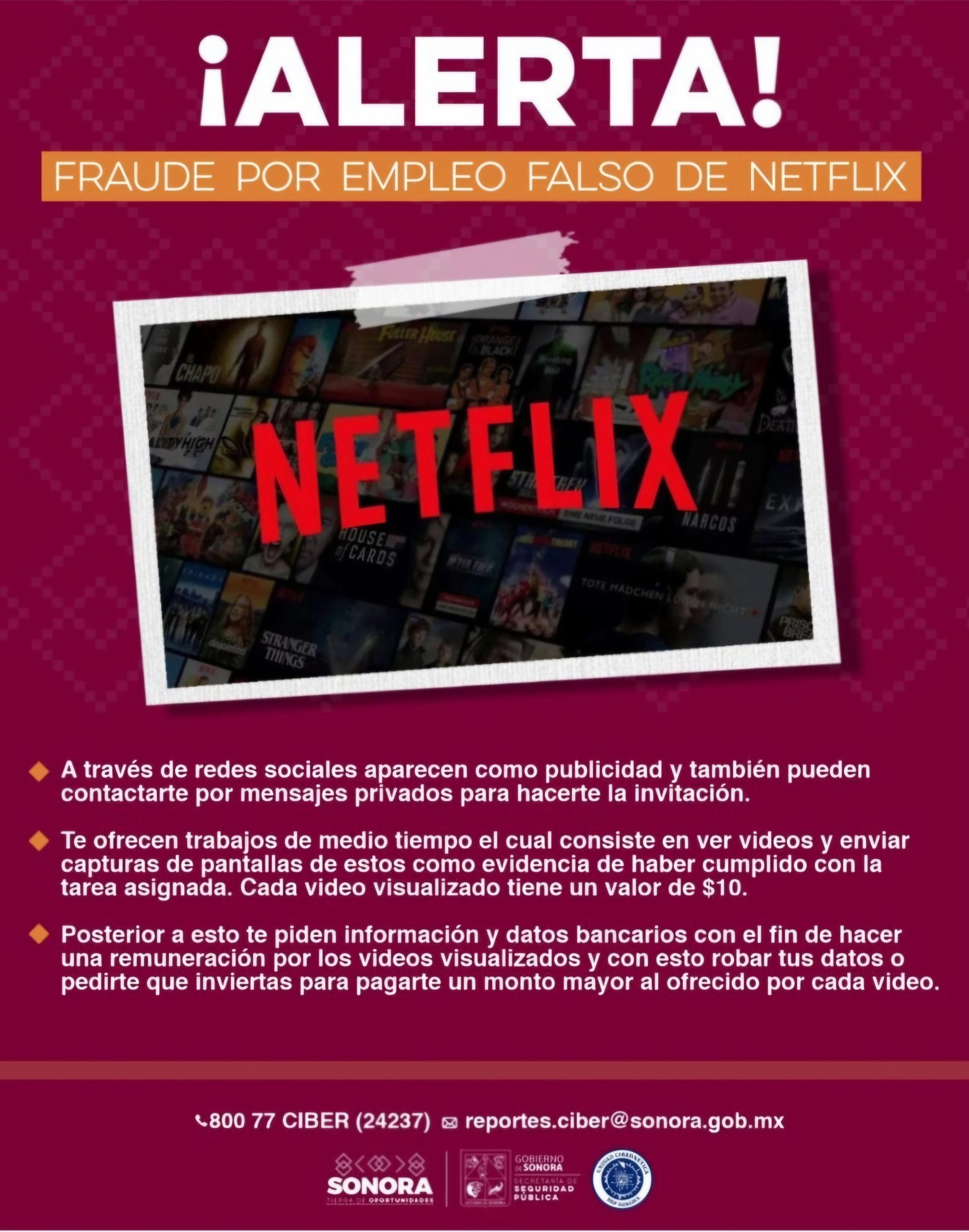 Hermosillo, Sonora; 17 de julio de 2025.- En labores de ciberpatrullaje en redes sociales, el Gobierno de Sonora identificó una nueva modalidad de fraude que oferta empleos falsos en nombre de la empresa Netflix, por lo que comparte recomendaciones para evitar ser víctima de este tipo de delitos.