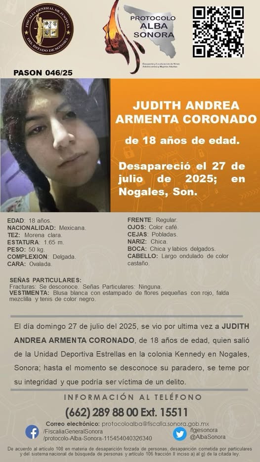 Se solicita a la ciudadanía su colaboración en la difusión de la cédula de #ProtocoloALBA para la búsqueda y pronta localización de JUDITH ANDREA ARMENTA CORONADO, de 18 años de edad. Desapareció el 27 de julio de 2025, en Nogales, Sonora.
