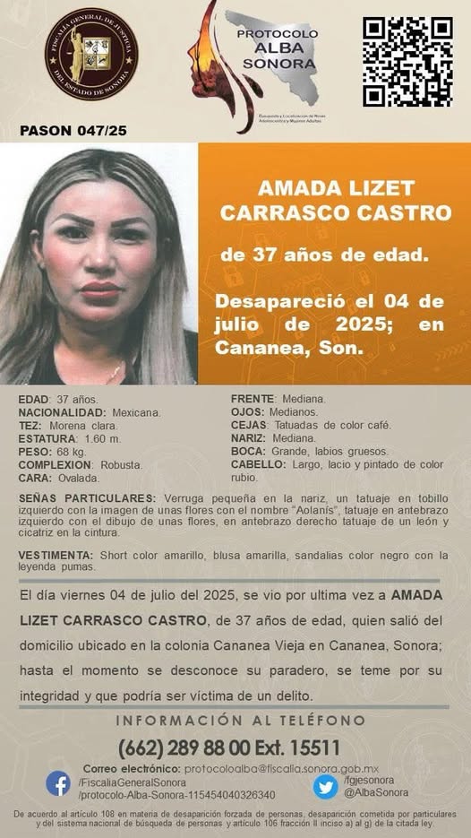 Para la búsqueda y pronta localización de AMADA LIZET CARRASCO CASTRO, de 37 años de edad. Desapareció el 04 de julio de 2025, en Cananea, Sonora.