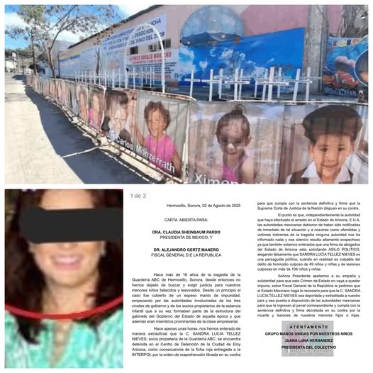 El colectivo Manos Unidas exige a la presidenta Claudia Sheinbaum y al fiscal Alejandro Gertz Manero su extradición inmediata. A 16 años de la tragedia, las familias siguen exigiendo justicia.