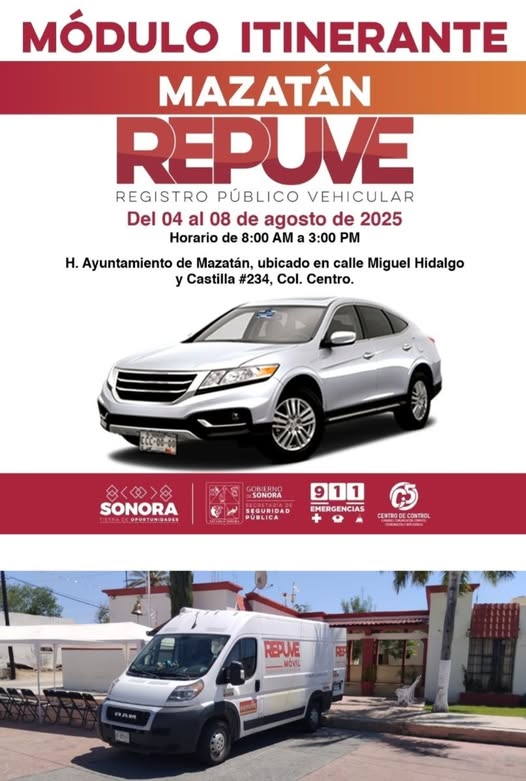 La SSP Sonora informó que la unidad móvil se encuentra frente a las instalaciones del H. Ayuntamiento de Mazatán, ubicado en calle Miguel Hidalgo y Castilla número 234, colonia Centro, en un horario de atención de 8:00 a 15:00 horas.